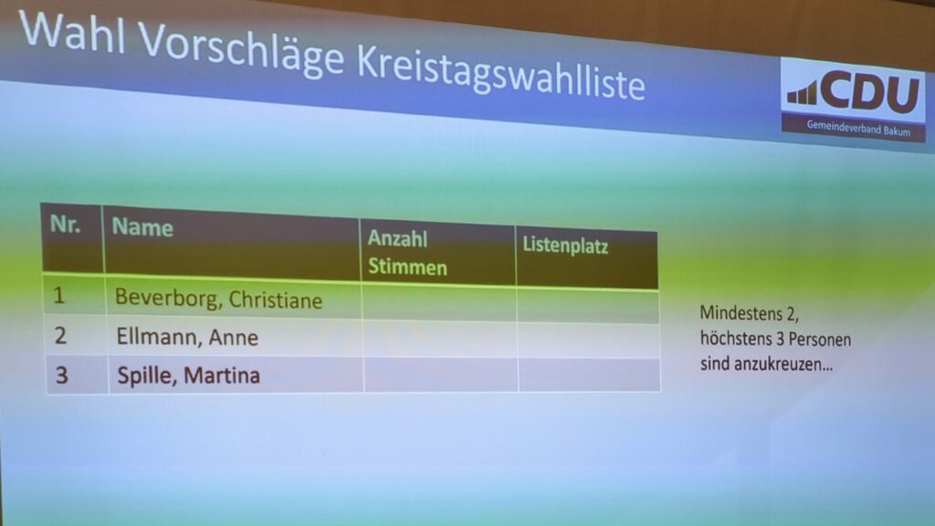 Die neue CDU-Vorsitzende Martina Spille freute sich, dass 130 CDU Mitglieder an dieser Versammlung teilnahmen. Es hätten sich 20 Frauen und Männer aus allen Teilen Bakums bereit erklärt, sich um die Kandidatur für den Gemeinderat oder den Kreistag zu bewerben, sagte sie. Paritätisch bewarben sich jeweils 10 Frauen und 10 Männer, davon drei Kandidatinnen für den Kreistag sowie 7 Kandidatinnen und 10 Kandidaten für den Gemeinderat.